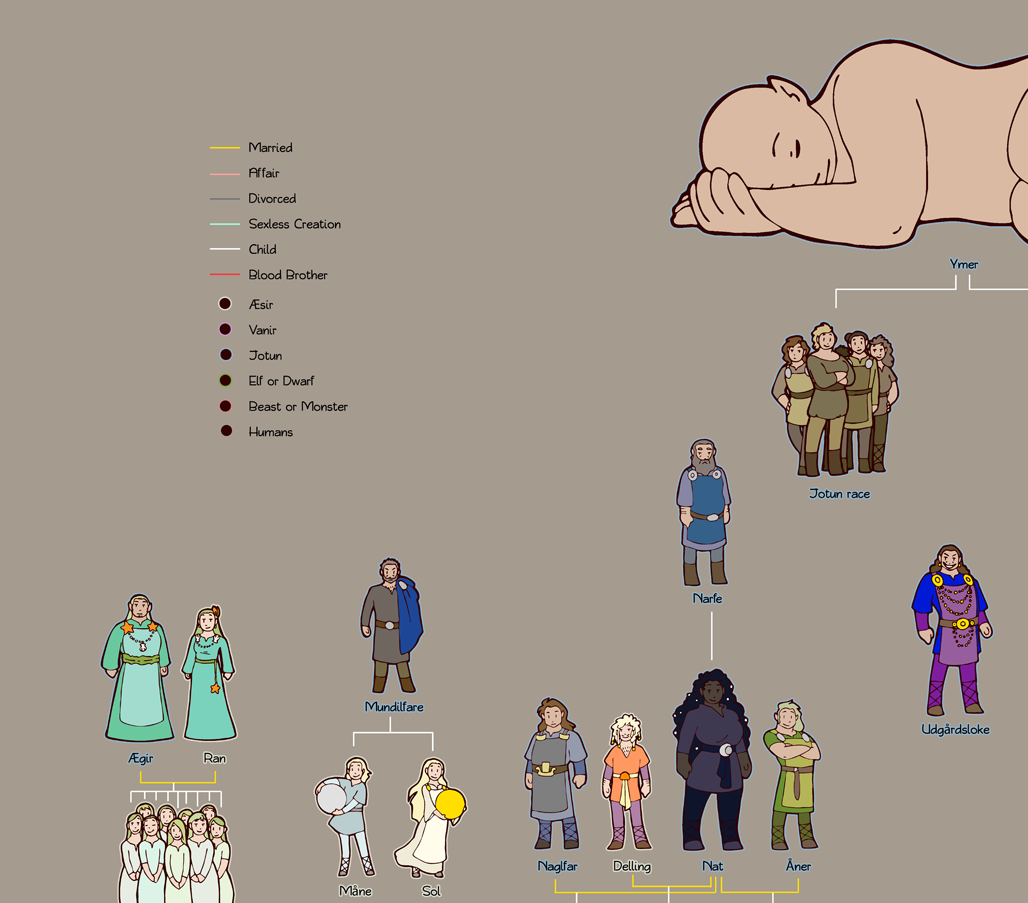 In one text Odin is the father of Tyr, but in another Hymer is his father. Depending on what people prefer they might claim either Frigg or Hrodr is his mother, but neither is mentioned as his parents, just wives. That’s why I just put both Odin and Hymer as Tyr’s parents. Male Jotuns could give birth, so there’s nothing standing in the way of this.