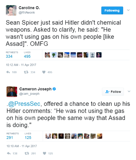 Happy Passover from the White House. Sean Spicer claims Hitler “didn’t use chemical weapons on his own people.” Uh, GAS CHAMBERS anyone? Or are we reading Richard Spencer’s history books now?